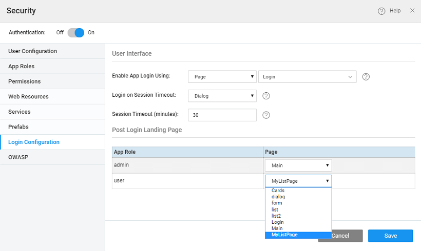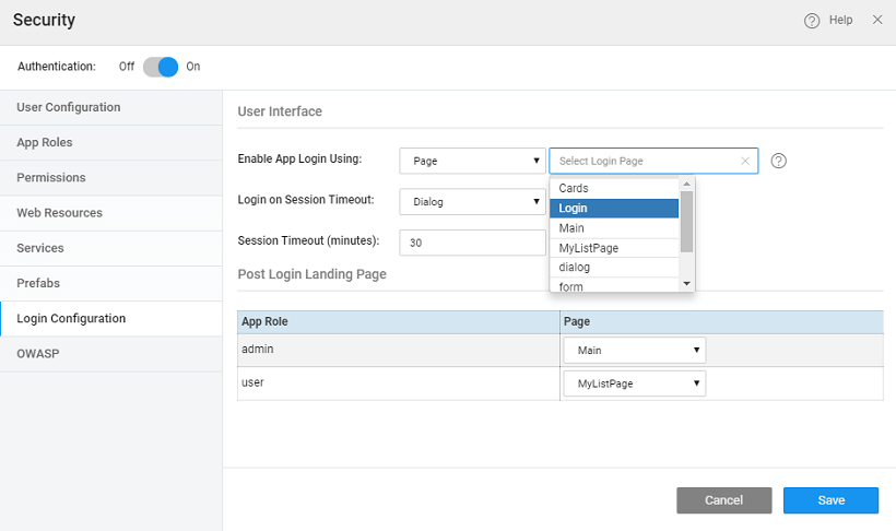 Session timeout behavior can also be defined. Session timeout occurs due to session inactivity or deletion of browser cookies. The re-login mechanism in the app can be configured as follows: