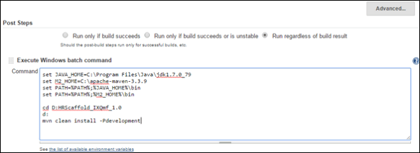 Ref for installing Jenkins https://wiki.jenkins-ci.org/display/JENKINS/Installing+Jenkins WaveMaker provides two profiles development, production by default. To execute profiles user needs to execute the command as: mvn clean install -Pdevelopment for development configuration and mvn clean install -Pproduction for production configuration. Install Jenkins and create a job and set windows batch command as maven command(mvn clean install -Pdevelopment)