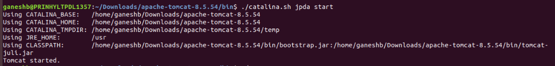 2. Now change directory to the Tomcat bin folder from terminal and type the below command (catalina.sh for Mac/Linux or catalina.bat for Windows) to Start Tomcat in debug mode: