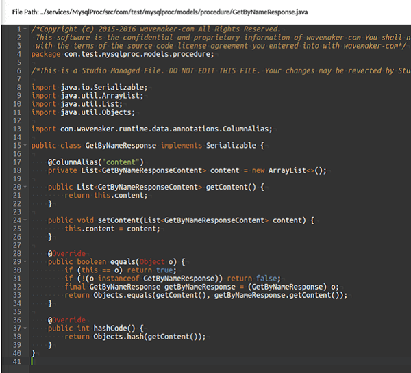 For all queries and procedures, there will be a Rest API generated with the Service layer. Along with the API, depending on the query or procedure type, request and response POJO classes are generated.