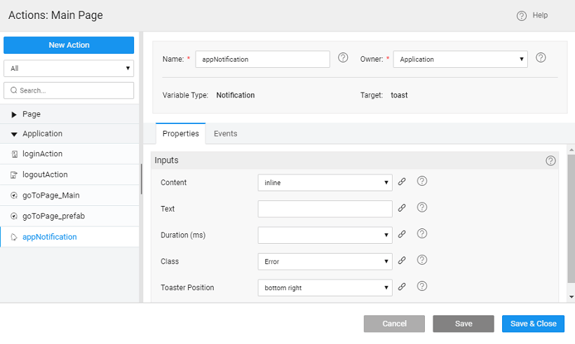 WaveMaker Variables dealing with external services like Web, Database etc. may not always return with a successful response. Sometimes the Variable call may fail due to various reasons like server validation, request timeout, etc. To gracefully handle such scenarios, a default Notification Action (toaster target) named appNotification is created in the app. By default, all Variables invoke this action on error response from the target service. This enables the app has a central point of error handling.