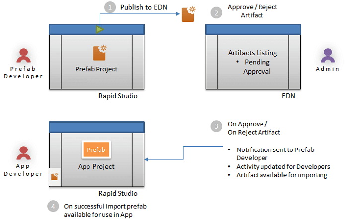 Prefab is developed from the Project Workspace, similar to any other app development, and then made available to other developers. Publishing states for a Prefab include: