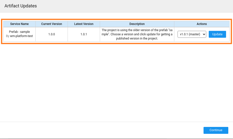 Every time there is a change or modification in an Artifact, it needs to be published again with updated version number. When a developer opens a project using the updated Artifact, Artifact updates are prompted. The developer can choose to update, downgrade, or ignore. Alternatively, notifications will be pushed for the developer within the studio to take action on Artifact upgrades.