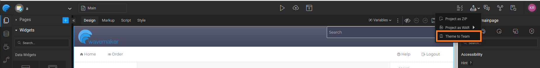 • Team Version: Themes can be published using the Export > Theme to Team option: