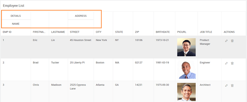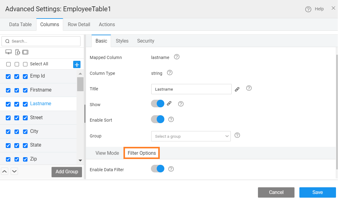 Format Options enables you to define the display format of the column at runtime. The options include toDate, toCurrency, prefix, suffix, and srtingtoNumber. Be aware that these format types selected are only for display purpose. During runtime, edit row will display the values as defined in the data source.