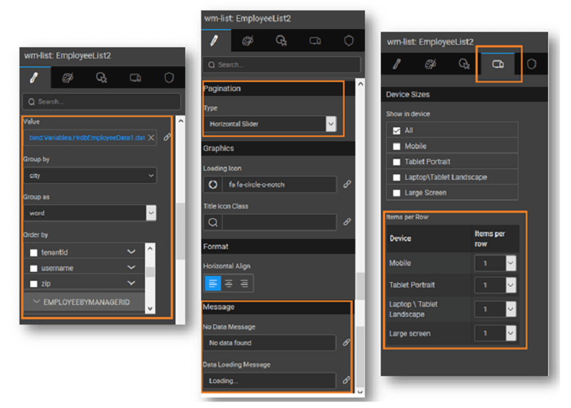 This property will help to order the list items based upon a field from the data source. You can also set the order as ascending or descending – by clicking on the arrows provided on the side of the field name.