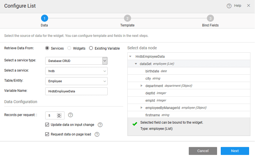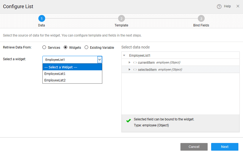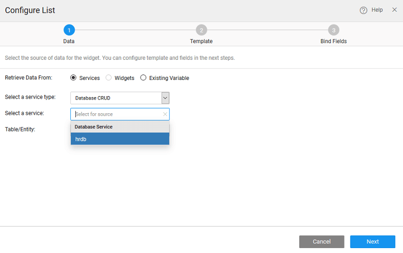 There can be different scenarios to deal with when configuring your List Widget with a data source. The data source can be from a service like a Database, web or Java Service or from an another widget on the page.