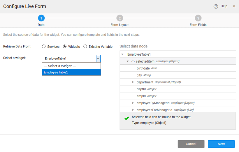The first step in configuring a Live Form is to define the data that needs to be displayed. This data can be in the form of a Variable or another Widget.