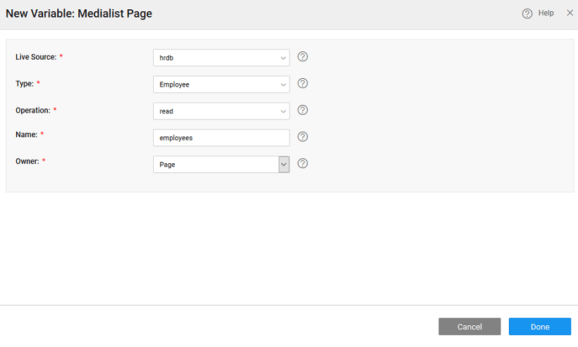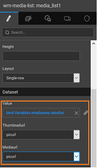 2. Bind the dataset value property of Medial List to ‘employees’ live variable dataset created in the previous step.