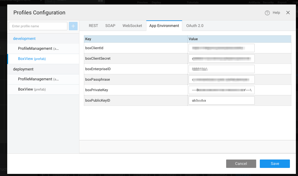 In your app’s Settings > Config profile > Box prefab > App Environment, add key-value pairs for the respective field from the downloaded App Settings json.