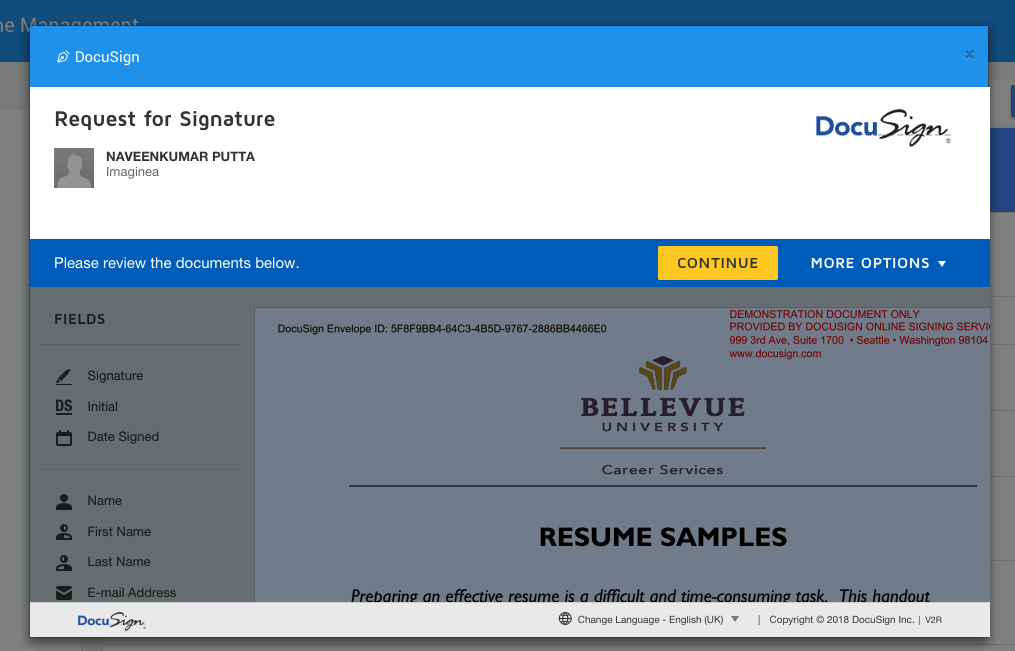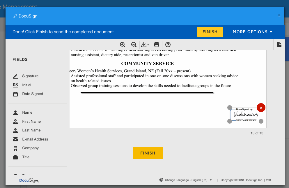 With the above steps done your Docusign prefab integration is complete. Now clicking on the E-sign link will invoke a Docusign dialogue and the your document will appear in the dialogue. Click continue to start the e-signing process. Click on the e-signing options from the left menu and e-sign the document. Then click finish button in the popup to complete the process.