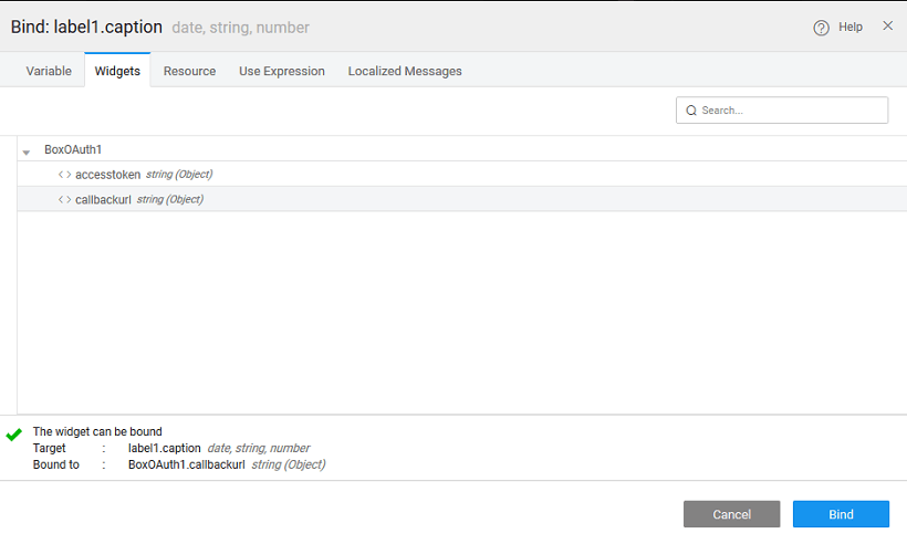 - Drag and drop a Label in the canvas. Click on Bind property to bind label with the