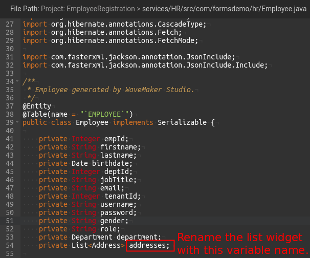 • Step-7: Now search for the ${ParentEntityName}.java file under FileExplorer and check the child entity reference name(variable name) and update the datatable widget name which dropped inside the parent LiveForm with the child reference variableName.