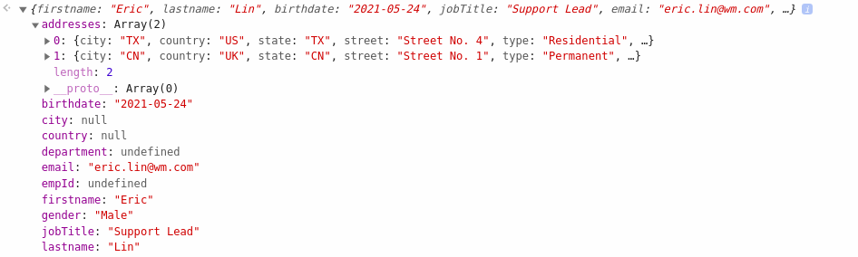 The final object structure will be as shown in the image below along with the employee details, i.e., two address object details, including, one residential and permanent addresses.