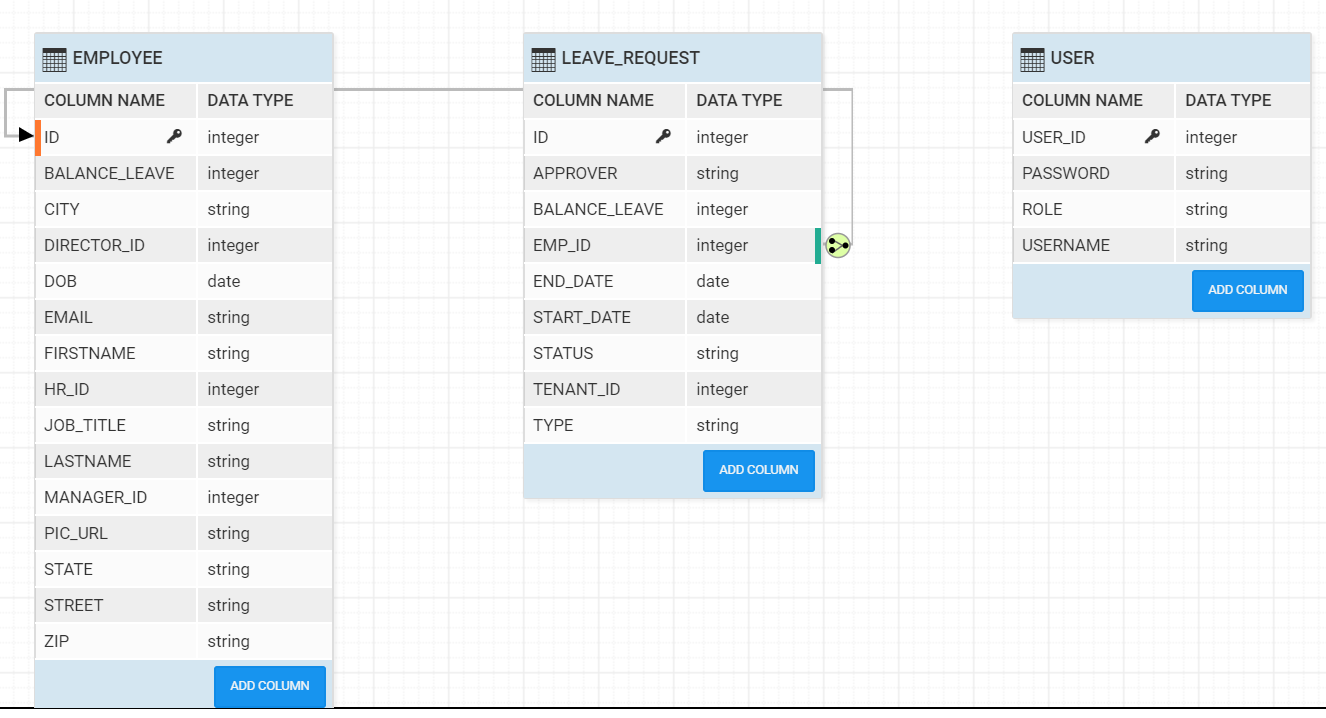 The following is the database design in WaveMaker for Leave Management Application. The model has employee details and his leave balance along with leave requests and history. Model has "user" table which has different role like HR, Manager and Director who are responsbile for leave request approval.