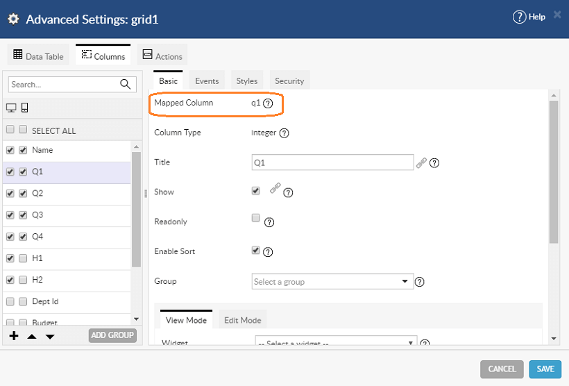 q1 and q1 are the Mapped Column name for the columns Q1 and Q2.