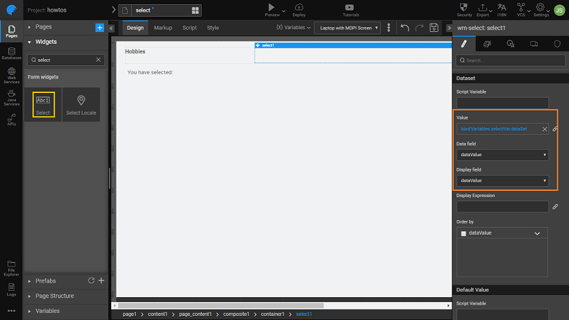 6. The selection made by the user is displayed in a Label widget, by binding the select datavalue to it.