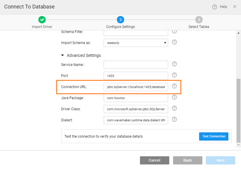 4. Provide Azure SQL server details such as Host, User Name, Password and Database Name, Schema Filter (comma-separated list of schema names to import) in the configure settings step and click on ADVANCED SETTINGS button to review the generated connection url. Note: The mappings between the Azure MS SQL Server and WaveMaker are given in the next section.