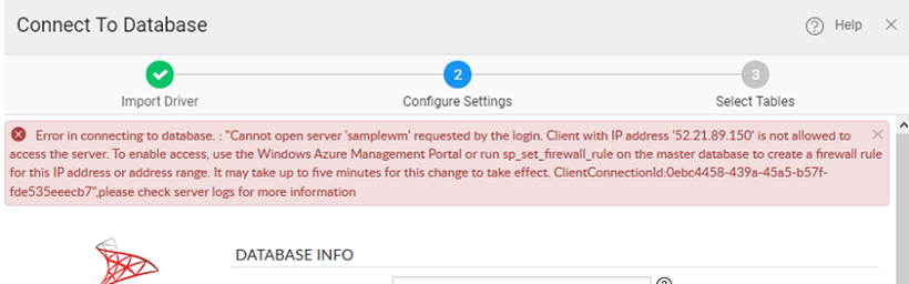 5. Once connection has been successfully established you will be provided with a connection success message and Next button will be enabled. In case you get an error message, check the Firewall settings at Azure as explained here.