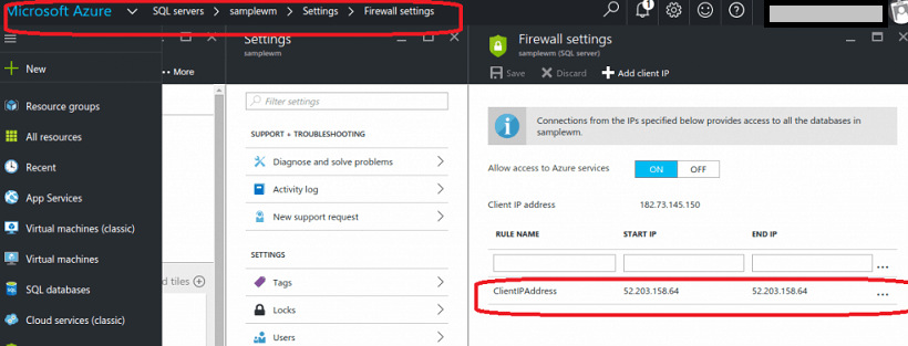 3. To set up firewall in Azure SQL navigate to Sql Servers-> <your-database-server> -> settings -> firewall settings