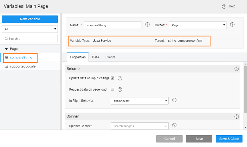 4. Add a Java Service for the string comparison logic. Use the same names that you gave in the Methods of Prefab Settings, in this case, String_compare for Java Service and confirm for the method Enter the following method to compare strings: