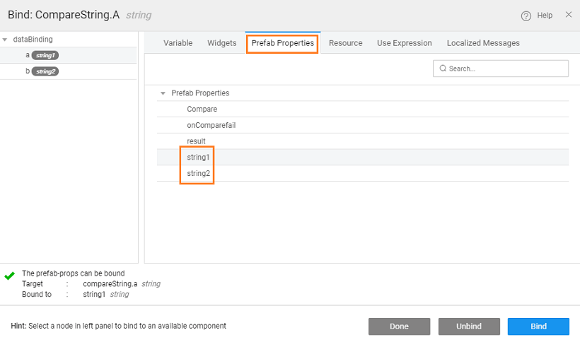 1. Drop two texts strings for comparison input to Prefab, a label to hold the result from the Prefab, a button to trigger the Prefab and the Prefab on the canvas. Your canvas should look like this (we have used a Grid Layout for widget placement)