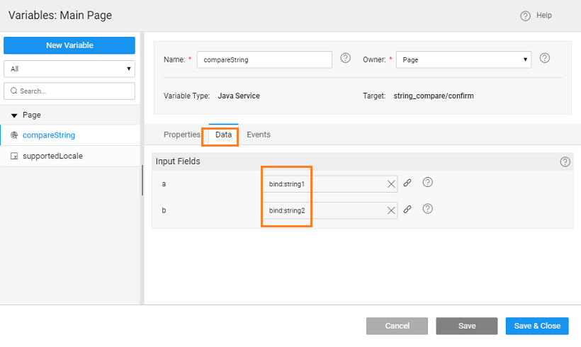 1. Pass the inbound parameters of the Prefab to the Java Service, by binding them to the input fields accessible from the Data tab.