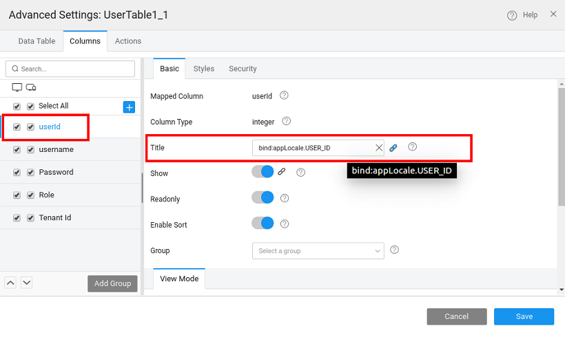 2. Open the Advanced Settings of the data table widget and navigate to the Columns tab.