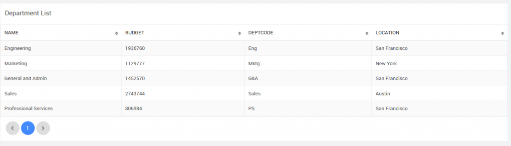 2. Drag and drop Data Table widget, and set the source of data to variable created from department entity. We have chosen Read-only. Simple View template for this example.