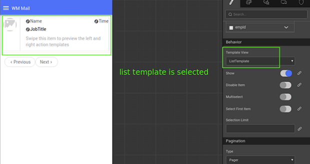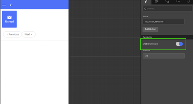 2. If LeftActionTemplate or RightActionTemplate is selected, then a list action template view will be added on the list with Position set to left (or right).