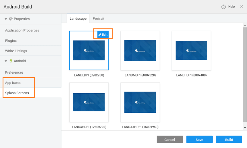 For WaveMaker Hybrid Mobile Apps, splash screens and app icons for various devices can be edited and uploaded. You can set them from the Build dialog.