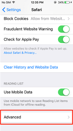 • In Safari Settings, Tap on Advanced