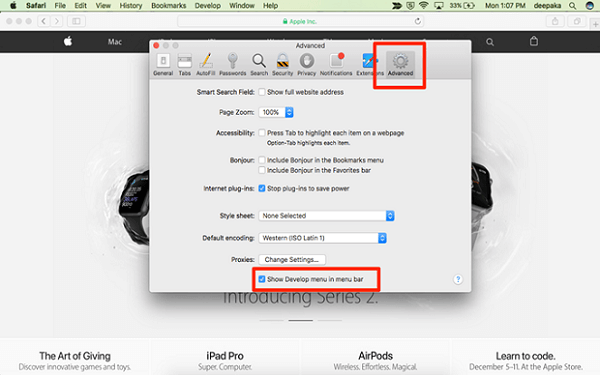 • Go to Advanced and check on ‘Show Develop Menu in menu bar’
