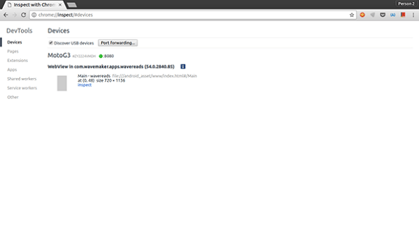 • On the desktop, open a chrome browser and go to ‘chrome://inspect#devices’. All available apps for debugging are shown on that page.