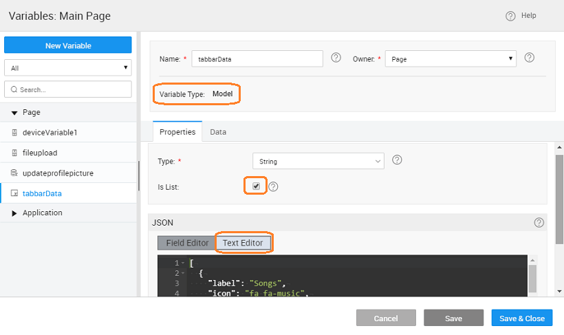 - Select the tabbar and bind Dataset Value property to the dataset of the Model Variable created earlier.