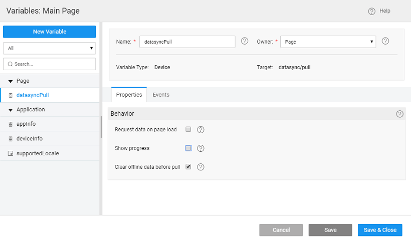 By default, three variables networkInfo, datasyncPush and datasyncPull are created when for any table offline is enabled. They are configured in such a way that whenever the user comes online, offline data changes (if any) are pushed automatically. Using these variables, custom workflows for data push can also be created. You can control the pull behavior through the datasyncPull variable's property: