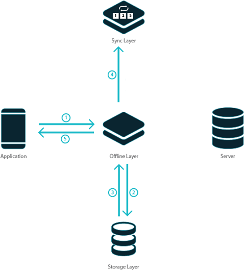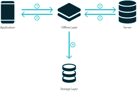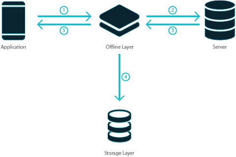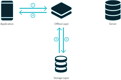 The offline layer intercepts all data requests. When the app is online, it forwards the request to the server and receives the responses from the server. When the app is offline, it consumes the request and provides the response. The offline layer includes: