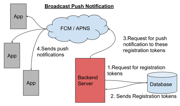 - When Backend wants to send a push notification to users, Backend retrieves the stored registration tokens of devices of those users.