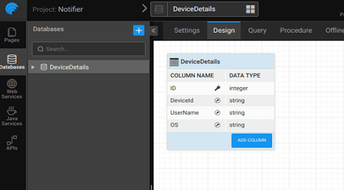 DeviceDetails, which will store all thedeviceIds,usernameand device type i.e. OS (Android or iOS). Mark these columns as unique.