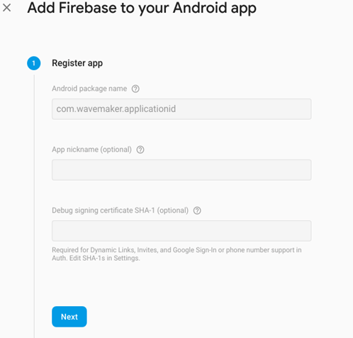 - A form appears to register your app. Application id that is mentioned in ‘export cordova dialog’ of your WaveMaker project has to be entered as Android package name in this form. Click Next.
