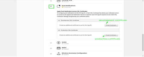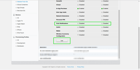 - If you have not already created an App ID, create it now and make sure push notifications is enabled. Or edit your existing App ID and enable them.