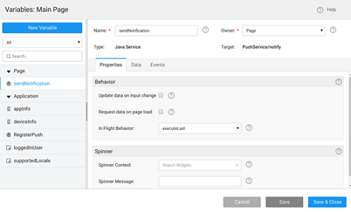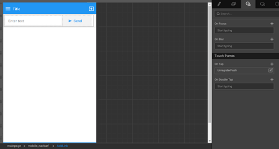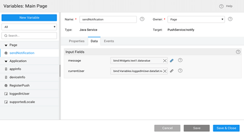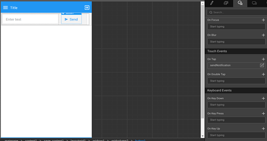 - On Send button tap, invoke the sendNotification service variable created above.Enter the text and click on button, push message will be delivered to the devices.