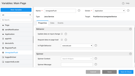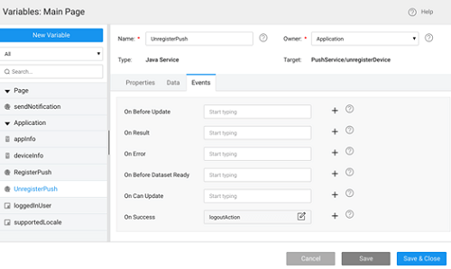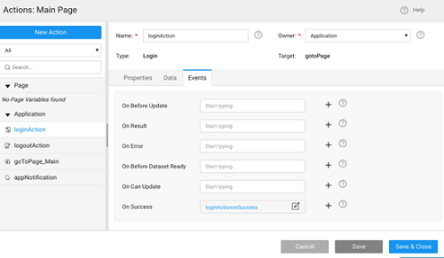 - On every successful login, register the device for receiving the push notification. For this, open the Actions dialog and select the pre-defined loginAction.