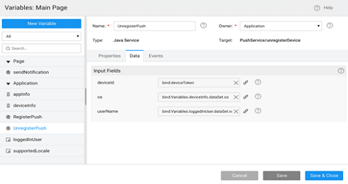 deviceIdtobind:deviceToken, which is inapp.js, os todeviceInfovariable anduserNametologgedInUserNamevariable as shown below.