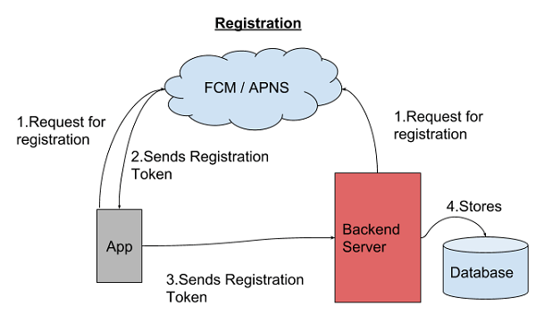 - Mobile App registers for device notifications and gets registration token. This token functions as the address to send a push notification to.
