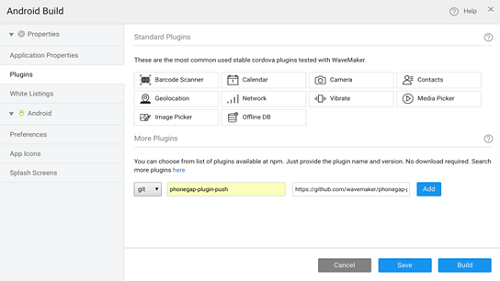 build.phonegap.com. So, Android builds fail when this plugin is added inbuild.phonegap.com. But, Android app can be built using the using Build For Android menu option inside WaveMaker studio or through a manual build.