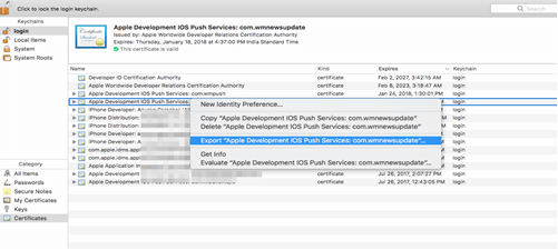 - Navigate to the certificate you want to use for your push notifications. Right-click and export it as a P12 certificate. Use as name