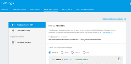 - In Firebase Console, go to settings and open ‘Service Accounts’ tab.