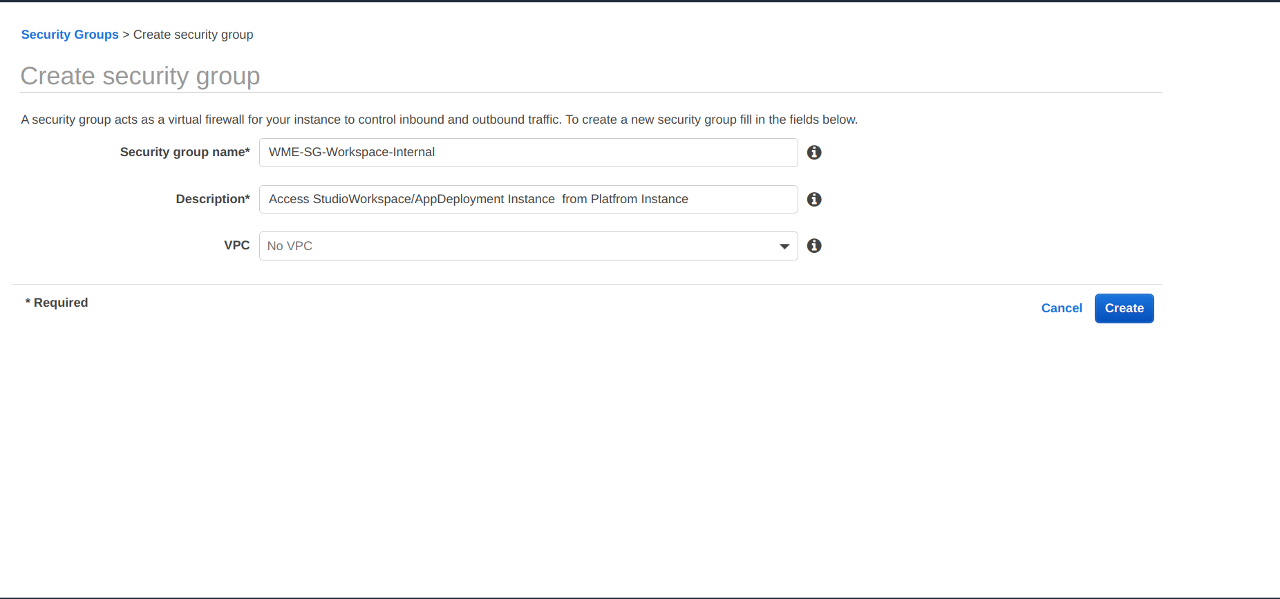 • Select inbound rules and edit rules to access from the StudioWorkspace Instance / AppDeployment Instance. At the source field, provide WME-SG-Workspace-Internal security group ID.