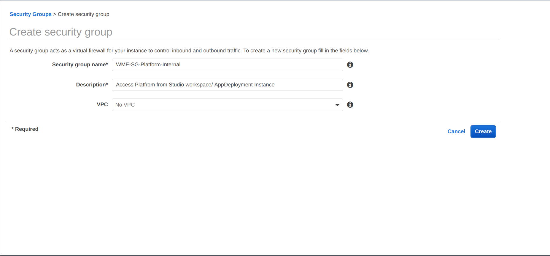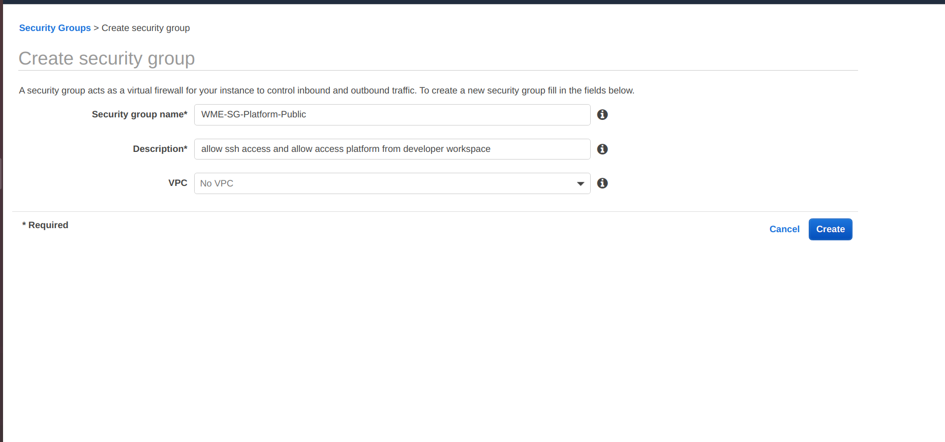 • Provide essential details for creating the security group and select the previously selected VPC.
